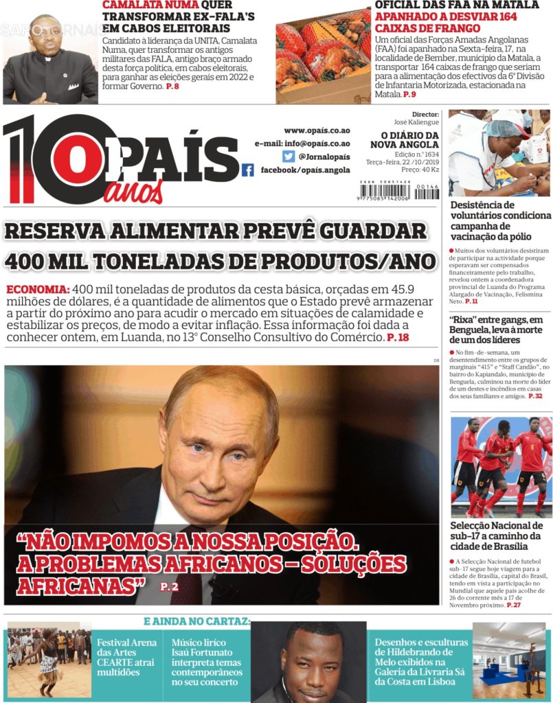PUTIN: ” PROBLEMAS AFRICANOS, SOLUÇÕES SÓ DOS AFRICANOS” Outubro 22, 2019 admin0 commentsUncategorized ” O PAÍS” ( ANGOLA/ ÁFRICA)