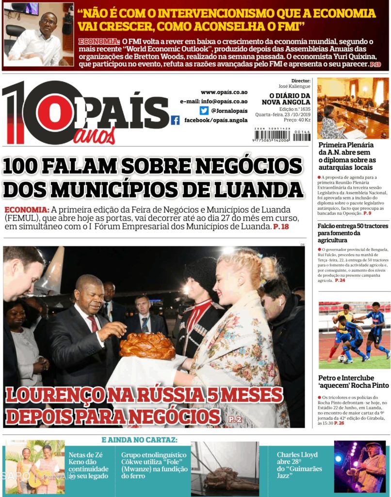 ANGOLA REJEITA RECEITAS DO FMI E VAI EM BUSCA DOS INVESTIMENTOS RUSSOS Outubro 23, 2019Outubro 23, 2019 admin0 commentsUncategorized ” O PAÍS” ( ANGOLA / ÁFRICA)