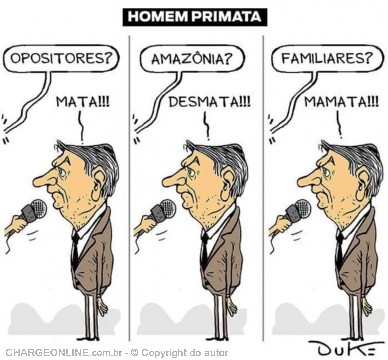 E o que ele verdadeiramente é? Um primata que revela um desprezo olímpico pela verdade (atenção: não se trata apenas de mentir, é pior: ele ignora qualquer outra realidade além da que sua mente enfermiça fabrica), incapaz de conter os surtos de histeria que o afetam sem pausa, e que agora preside este país abestalhado e inerte.