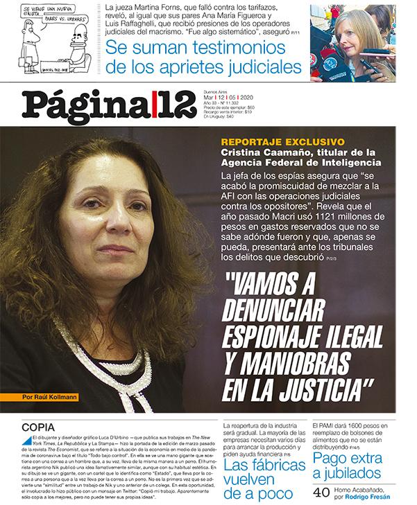CRISTINA CAAMAÑO, DA AGÊNCIA DE INTELIGÊNCIA DA ARGENTINA: ” NÃO HAVERÁ OPERAÇÕES JUDICIAIS CONTRA OPOSITORES” Maio 12, 2020 admin0 commentsUncategorized “PÁGINA 12” ( ARGENTINA)