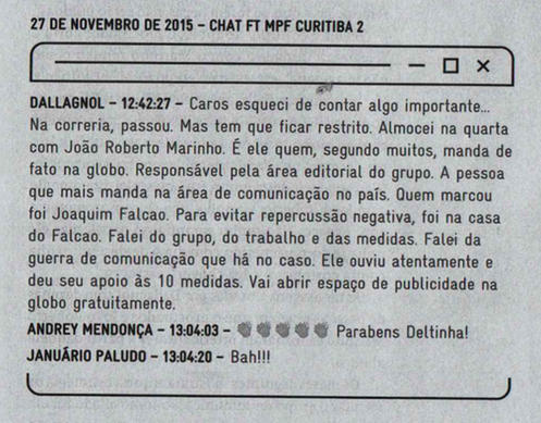 Em novembro de 2015, Deltan se encontrou com João Roberto, presidente do Conselho Editorial.