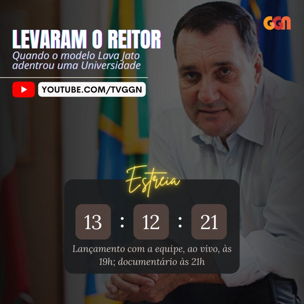 Jornal GGN – O documentário “LEVARAM O REITOR – Quando o modelo Lava Jato adentrou uma Universidade” estreia nesta segunda, 13 de dezembro, às 21h, no canal do GGN no Youtube, com evento de lançamento a partir das 19h.