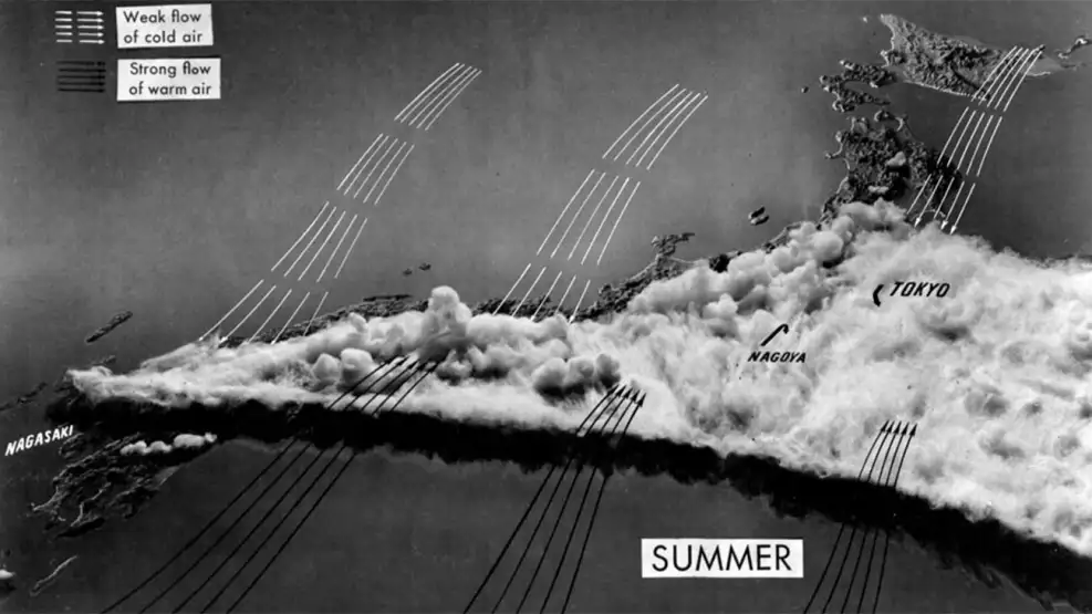 Os aviões chegaram às 10h44. No relatório de voo, a tripulação observou: “O alvo estava obscurecido por uma densa camada de neblina e fumaça “. Um dos pilotos escreveu que havia 7/10 de cobertura de nuvens e, nesse cenário, “a bomba poderia ser lançada visualmente, mas não acho que nossas chances sejam muito boas”.