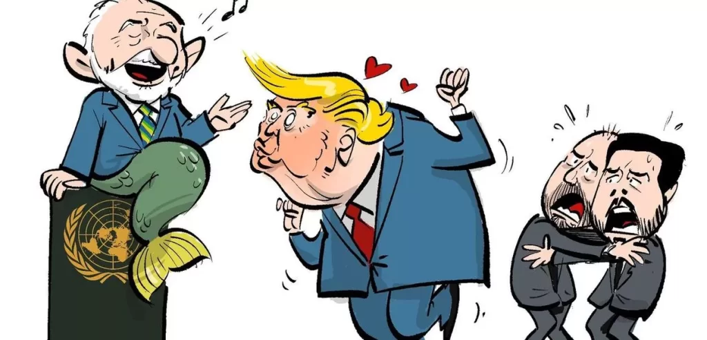 “Ele gosta de mim e eu gosto dele”, ousou Trump dizer sobre Lula, que até agora não lhe fez coro nas redes sociais. Sendo Trump, ele falou da boa química surgida entre eles mas não deixou de fustigar o Brasil, na sequencia de seu discurso, afirmando que o país vai mal e não ficará bem enquanto não estiver trabalhando com os EUA, o que deve significar uma concordância ampla em muitos assuntos.