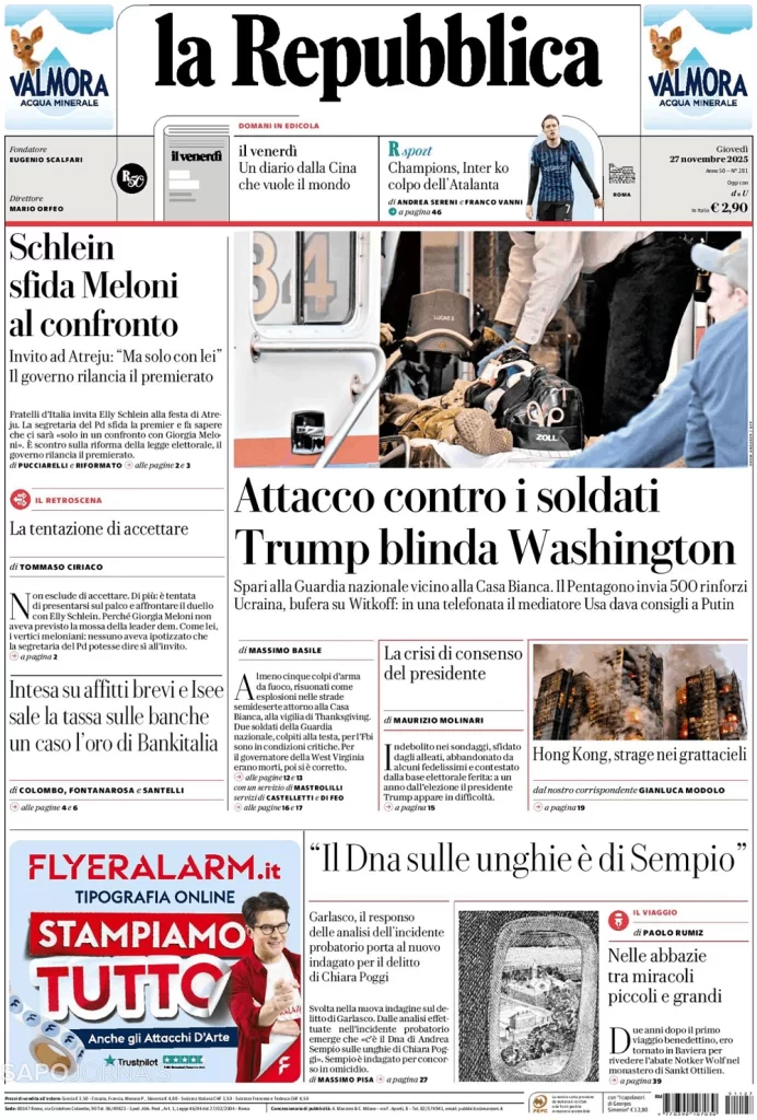 ATAQUE CONTRA UM SOLDADO, TRUMP BLINDA WASHINGTON Novembro 27, 2025 admin0 commentsUncategorized JORNAL INDEPENDENTE DA ITÁLIA