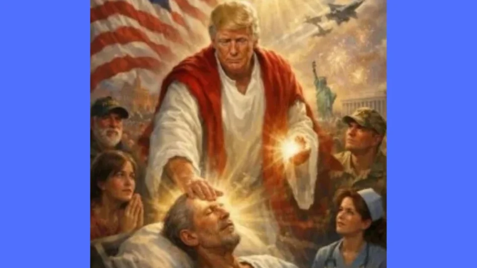 Na imagem postada em plataforma de sua propriedade, a Truth Social, Trump é retratado com uma  túnica vermelha e branca, com a mão na testa de uma pessoa, que estaria sendo curada. Alguns soldados aparecem flutuando no céu como anjos, ao lado de águias e de aviões de guerra. Também é possível ver uma criança rezando, uma enfermeira, a bandeira dos Estados Unidos e a Estátua da Liberdade.